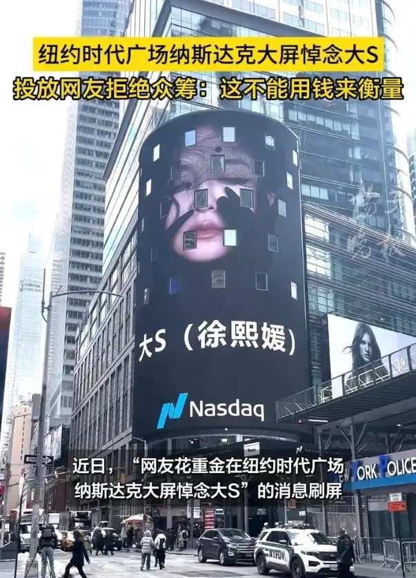 近日,“网友花重金在纽约时代广场纳斯达克大屏悼念大S”的消息刷屏,许多网友感动表示,“谢谢让我们记住她最美的样子”。记者在社交平台联系上了发起者,提及花费重金投放,她表示,这跟钱真的没关系,它不能用钱来衡量。85后四川网友“蒋二二”告诉记者看到大S去世的消息挺惊讶也很难过,“因为社交平台一直用的她的头像,从初中开始身边就有同学说我长的像她,我们挺有缘分,就想悼念一下她。因为纽约时代广场纳斯达克大屏每年对全世界名人去世都会悼念,所以我就把这件事做了”。